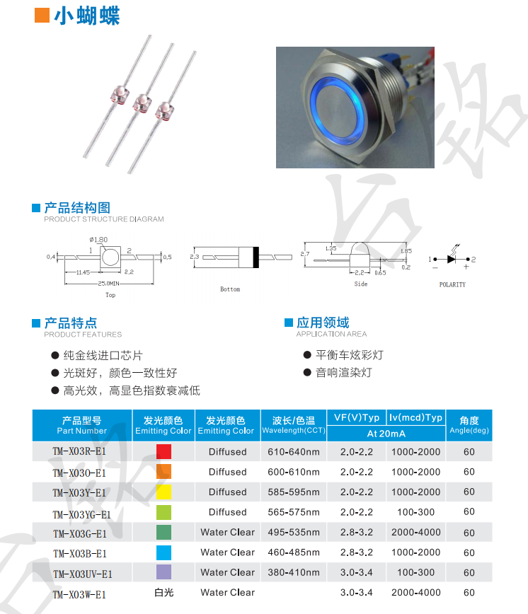 产品应用:高端数码应用、电子产品应用、家用电器应用、信号指示应用、仪器仪表应用、工业照明应用。
